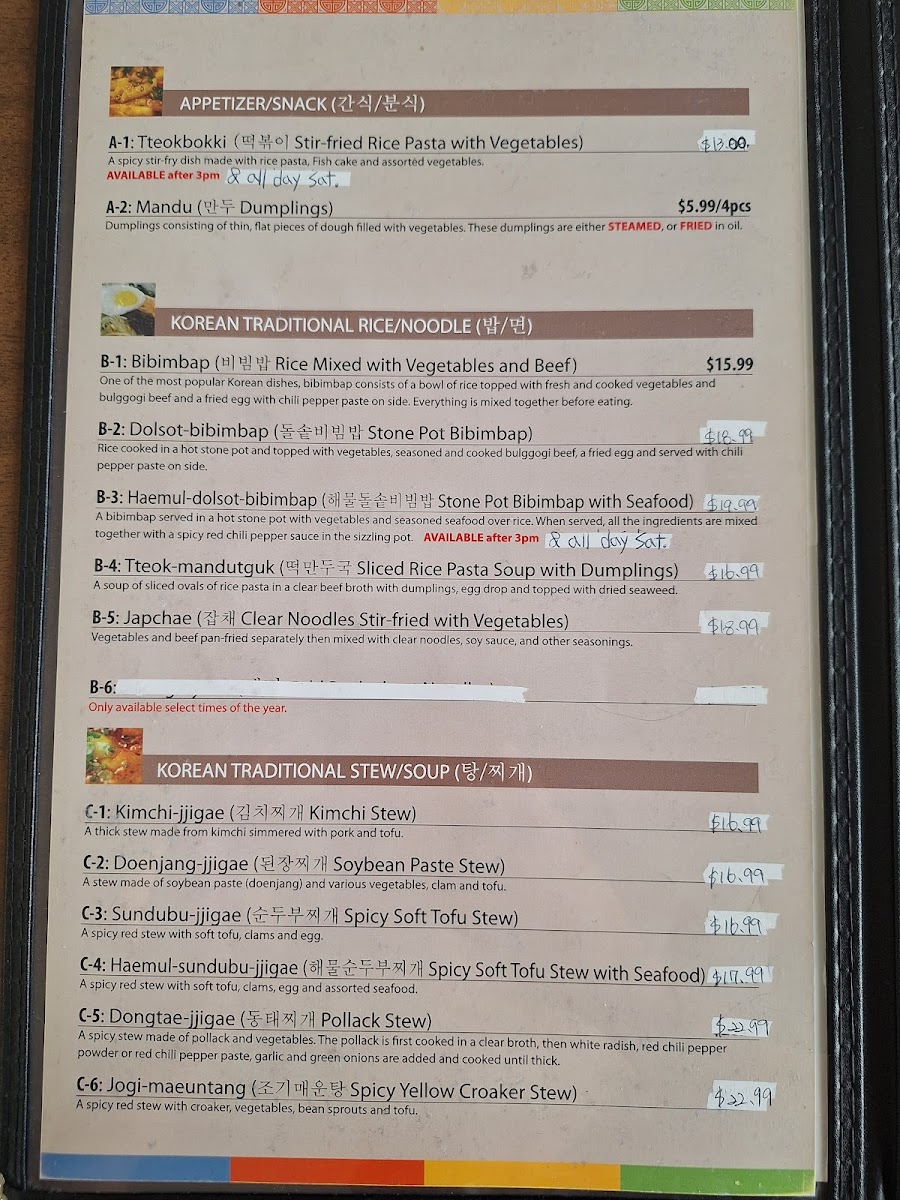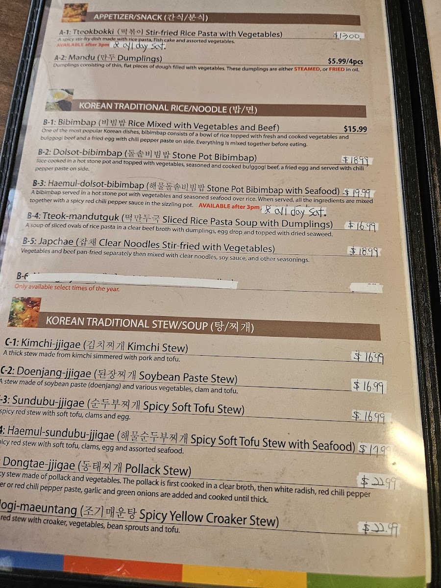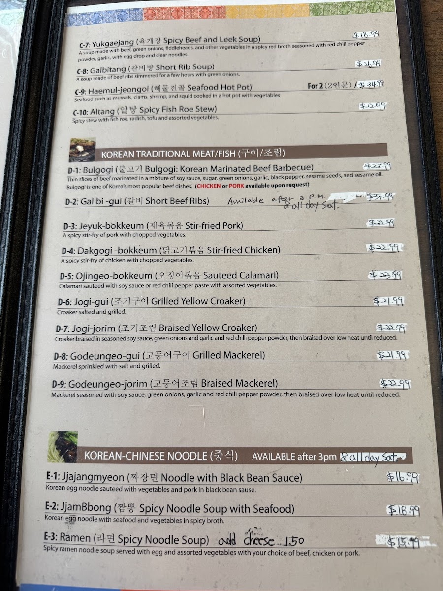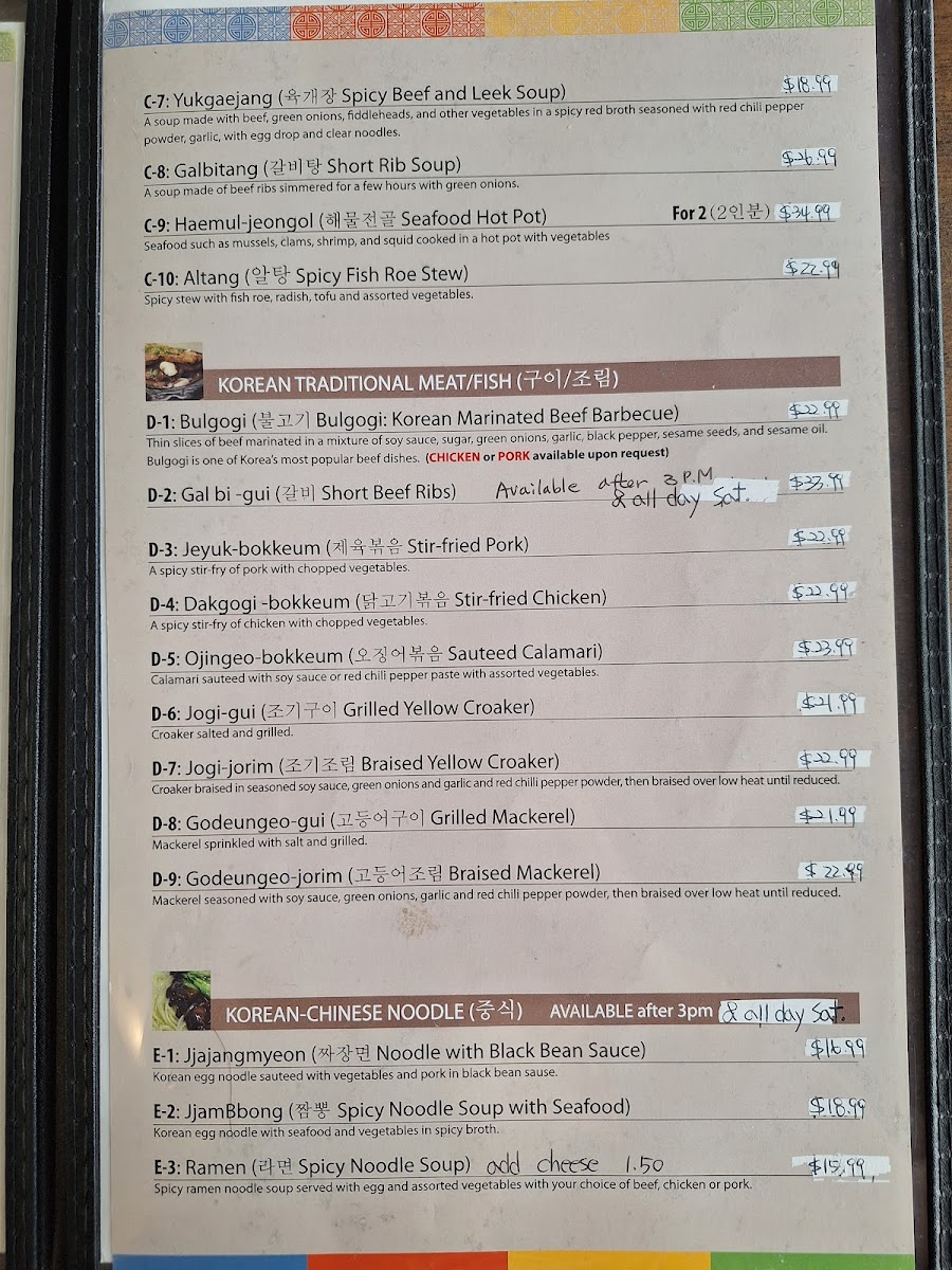 If you're craving something heartier, dive into the flavors of the sea with the JogiJorim ($16.99), featuring braised yellow croaker prepared with a delicate touch of soy sauce, green onions, and garlic. For those who appreciate the rich flavors of mackerel, the GodeungeoJorim, seasoned and slow-cooked to succulent perfection, is a must-try.