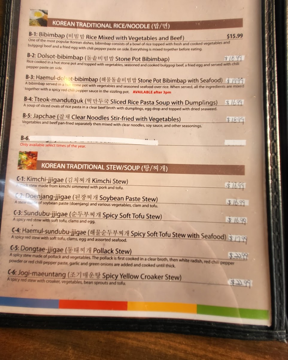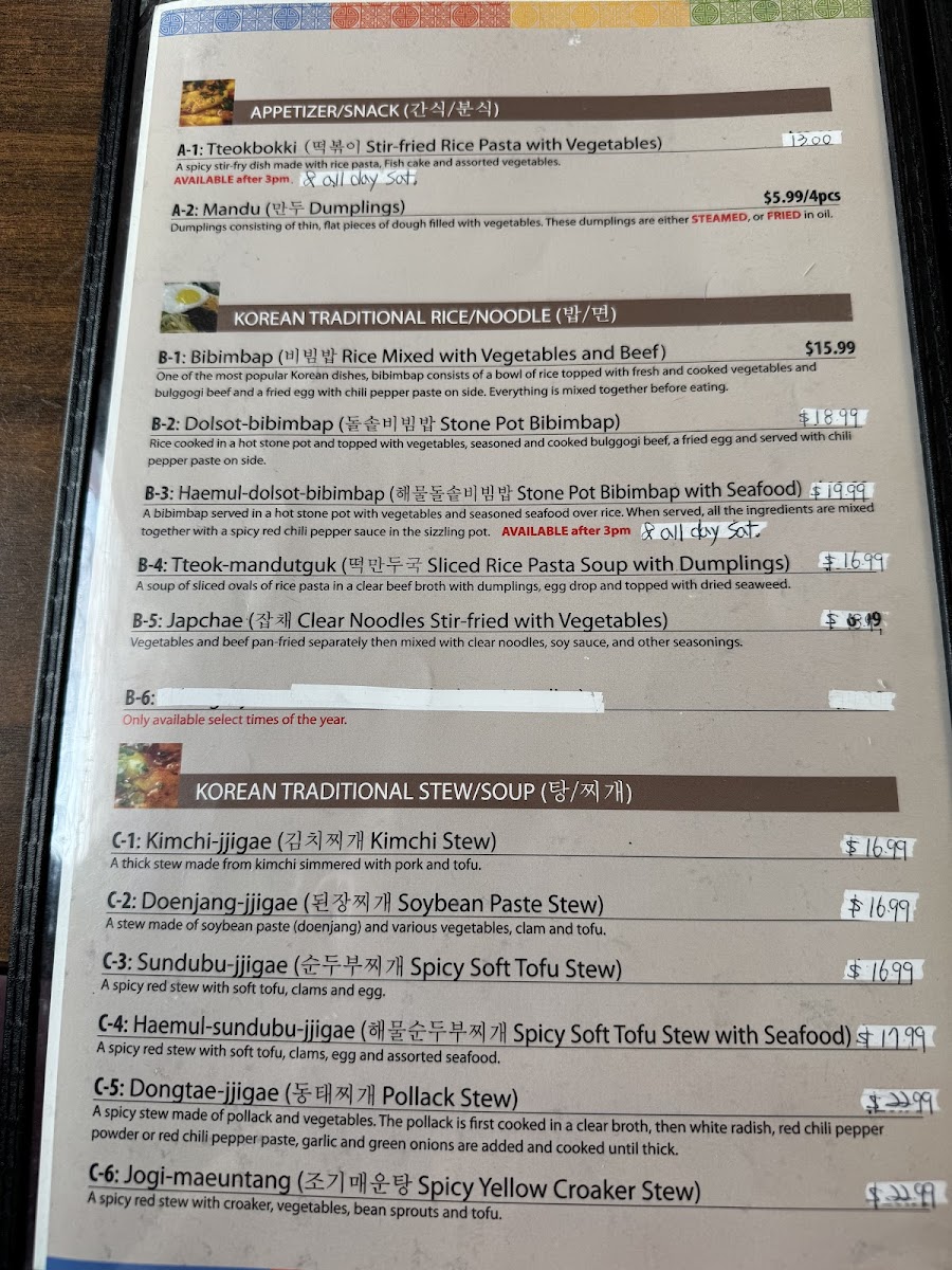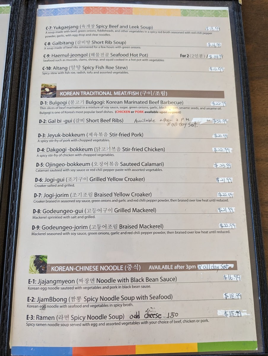 If you're craving something heartier, dive into the flavors of the sea with the JogiJorim ($16.99), featuring braised yellow croaker prepared with a delicate touch of soy sauce, green onions, and garlic. For those who appreciate the rich flavors of mackerel, the GodeungeoJorim, seasoned and slow-cooked to succulent perfection, is a must-try.